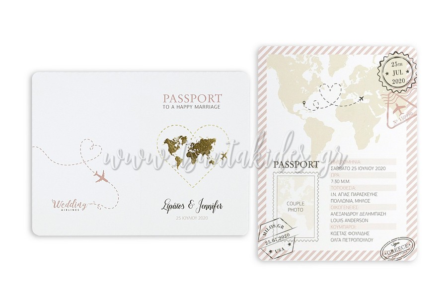 Προσκλητήριο γάμου με μοντέρνο ύφος σε στυλ passport. Το προσκλητήριο διαθέτει δίπτυχη κάρτα σε λευκό ματ χαρτί 250γρ. με εκτύπωση και χρυσοτυπία στο εξωτερικό την καρδιά και το χάρτη. Στο προσκλητήριο περιλαμβάνεται και ο τρίπτυχος φάκελος διάστασης 10,5×23,5cm σε ιβουάρ ματ χαρτί 290γρ. με ανάγλυφη αίσθηση. Η κάρτα για τους καλεσμένους είναι τυπωμένη σε λευκό ματ χαρτί 250γρ.