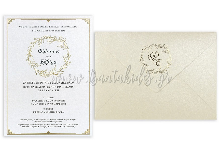 • Έχετε τη δυνατότητα να προμηθευτείτε το προσκλητήριο σε δύο εκδοχές, είτε με τη χρυσοτυπία στο φάκελο είτε με την απαλοιφή αυτής. Το κόστος του προσκλητηρίου μεταβάλλεται ανάλογα με την επιλογή σας.