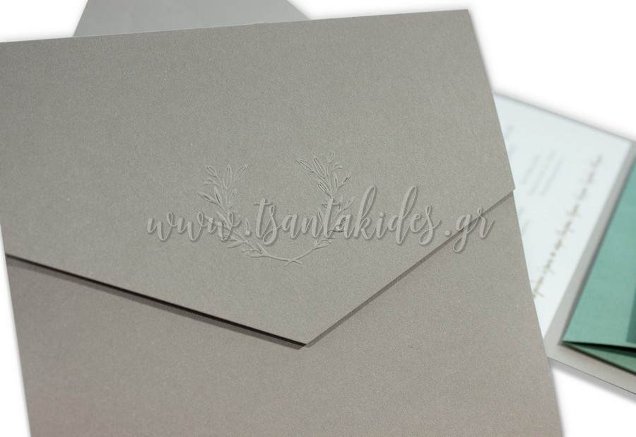 Προσκλητήριο γάμου με θέμα τα κλαδιά ελιάς. Το προσκλητήριο διαθέτει τρίπτυχο φάκελο διάστασης 16,5×16,5cm σε γκρι ματ χαρτί 250γρ. Οι κάρτες του προσκλητηρίου είναι τυπωμένες σε λευκό ματ χαρτί 250γρ., ενώ εσωτερικά υπάρχει και δεύτερος φάκελος σε βεραμάν ματ χαρτί 300γρ. Η ανάγλυφη απεικόνιση εξωτερικά του φακέλου προσδίδει επιπλέον κομψότητα στο προσκλητήριο.