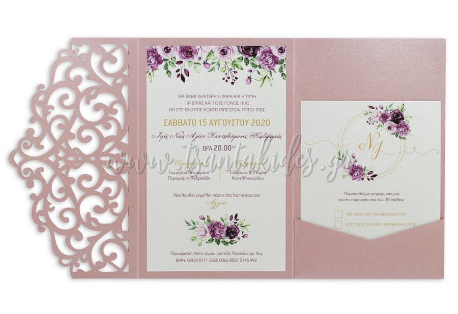 Προσκλητήριο γάμου με ρομαντικό ύφος και floral σχεδιασμό. Το προσκλητήριο διαθέτει τρίπτυχο laser cut φάκελο διάστασης 13,7×21,7cm σε rose περλέ χαρτί 250γρ. Η πρόσκληση και η κάρτα της δεξίωσης είναι τυπωμένες σε λευκό περλέ χαρτί 300γρ. Η κεντρική κάρτα του προσκλητηρίου είναι κολλημένη στο εσωτερικό του φακέλου. Η κάρτα δεξίωσης τοποθετείται στην τσέπη του φακέλου και έχει διάσταση 12,7×16cm.