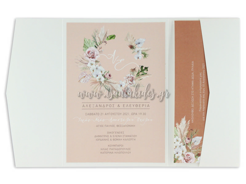 Προσκλητήριο γάμου με bohemian floral στοιχεία και dried pampas σε γήινες αποχρώσεις. Το προσκλητήριο διαθέτει τρίπτυχο φάκελο διάστασης 17×24cm με τσέπη για την κάρτα δεξίωσης σε λευκό ματ χαρτί 250γρ. Η κεντρική κάρτα του προσκλητηρίου, διάστασης 23×16cm και η κάρτα της δεξίωσης, διάστασης 23×10,5cm, είναι εκτυπωμένες στο ίδιο χαρτί. Η κάρτα της πρόσκλησης είναι κολλημένη στο κύριο σώμα του φακέλου. Για το κλείσιμο του φακέλου προτείνεται εκτυπωμένη λωρίδα στο ίδιο θέμα, διάστασης 36×6cm στα 120γρ.