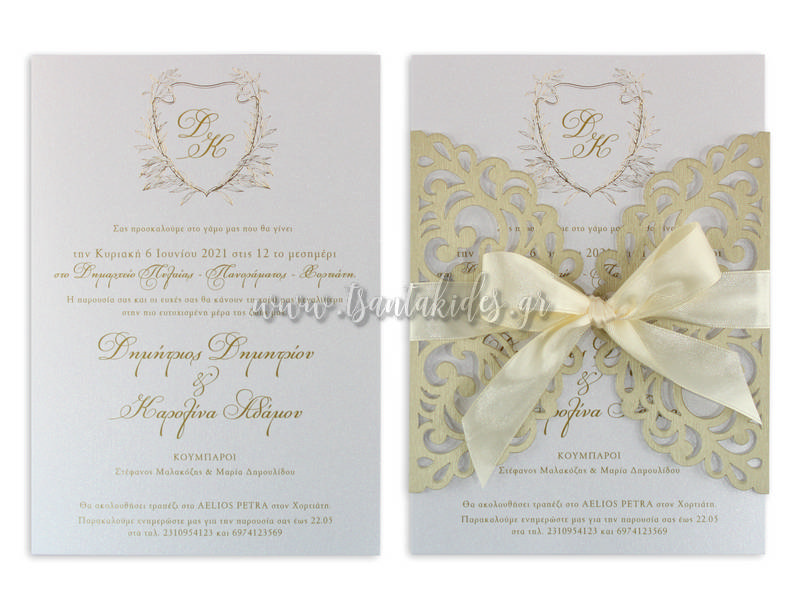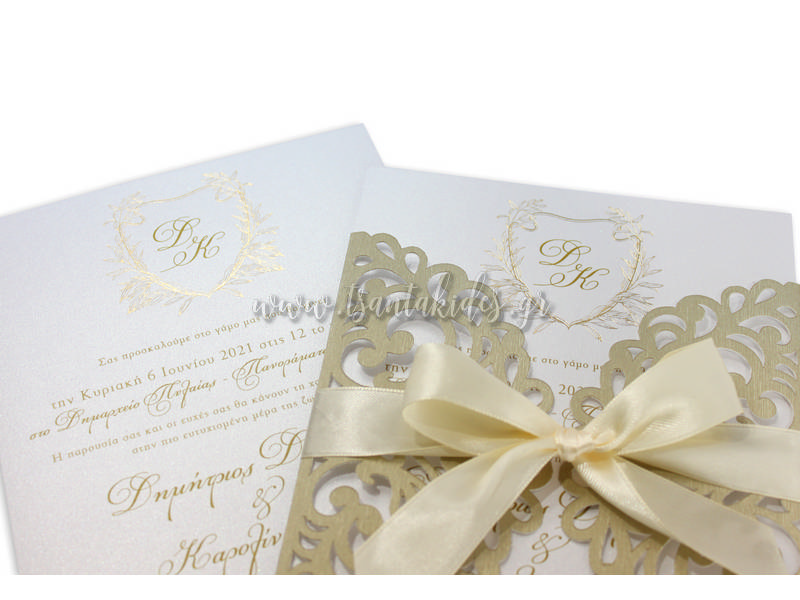 Προσκλητήριο γάμου με κομψό κλασσικό στυλ και χρυσοτυπία στο στεφάνι. Το προσκλητήριο διαθέτει τρίπτυχο laser cut φάκελο διάστασης 16×16cm σε χρυσό ανάγλυφο χαρτί δερματίνης. Η εσωτερική κάρτα είναι εκτυπωμένη σε λευκό περλέ χαρτί 300γρ. Έχετε τη δυνατότητα να προμηθευτείτε το προσκλητήριο σε δύο εκδοχές, είτε με τη χρυσοτυπία είτε με απλή εκτύπωση όπως το υπόλοιπο κείμενο. Το κόστος του προσκλητηρίου μεταβάλλεται ανάλογα με την επιλογή σας.