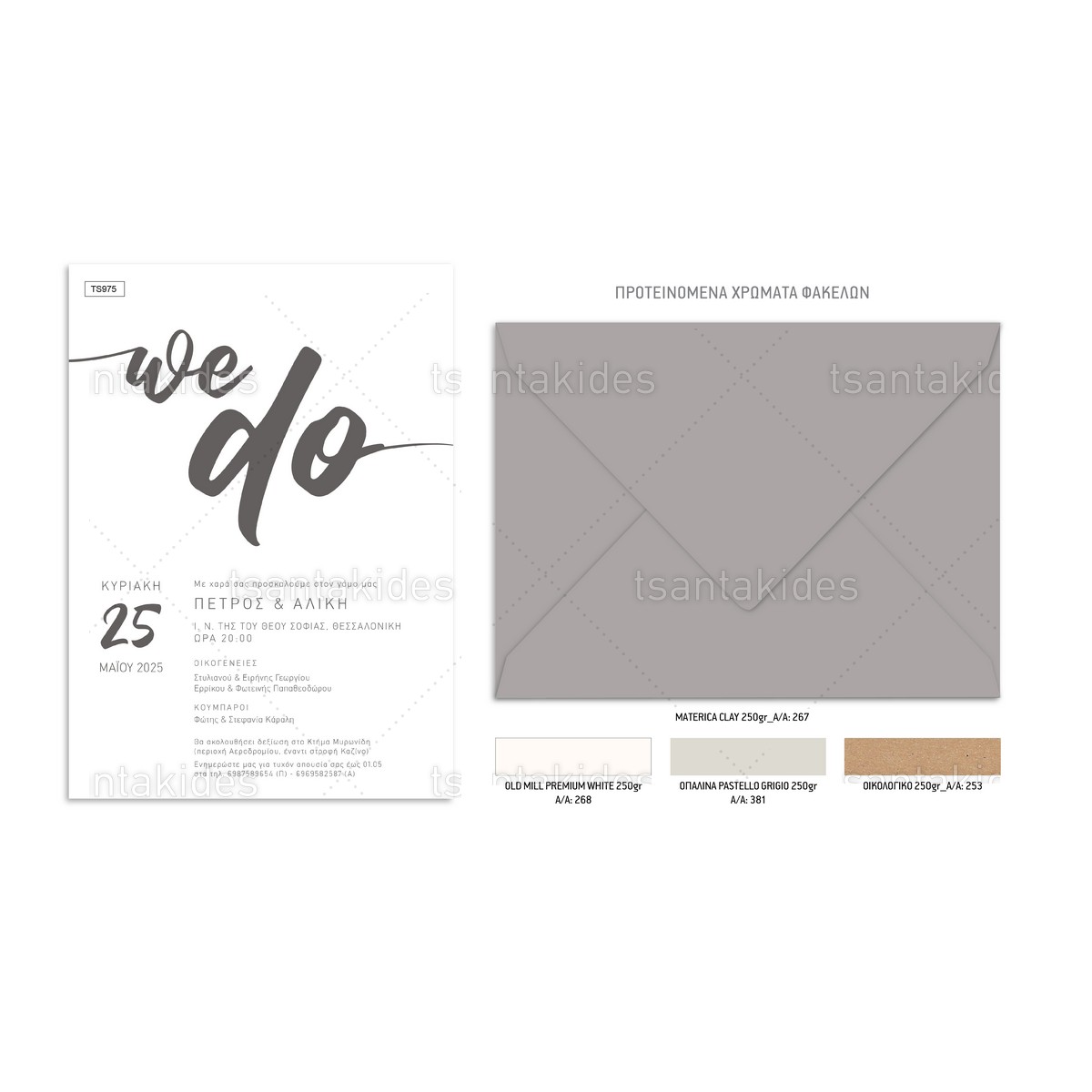 - Χαρτί Προσκλητηρίου: Για τον πάπυρο: ριζόχαρτο ή περλέ 120γρ. (λευκό/εκρού). Για την κάρτα: γκοφρέ, velvet ή περλέ 250γρ. (λευκό/εκρού).