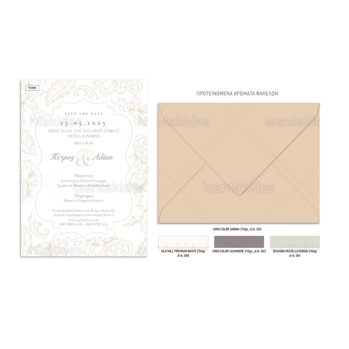 - Χαρτί Προσκλητηρίου: Για τον πάπυρο: ριζόχαρτο ή περλέ 120γρ. (λευκό/εκρού). Για την κάρτα: γκοφρέ, velvet ή περλέ 250γρ. (λευκό/εκρού).
