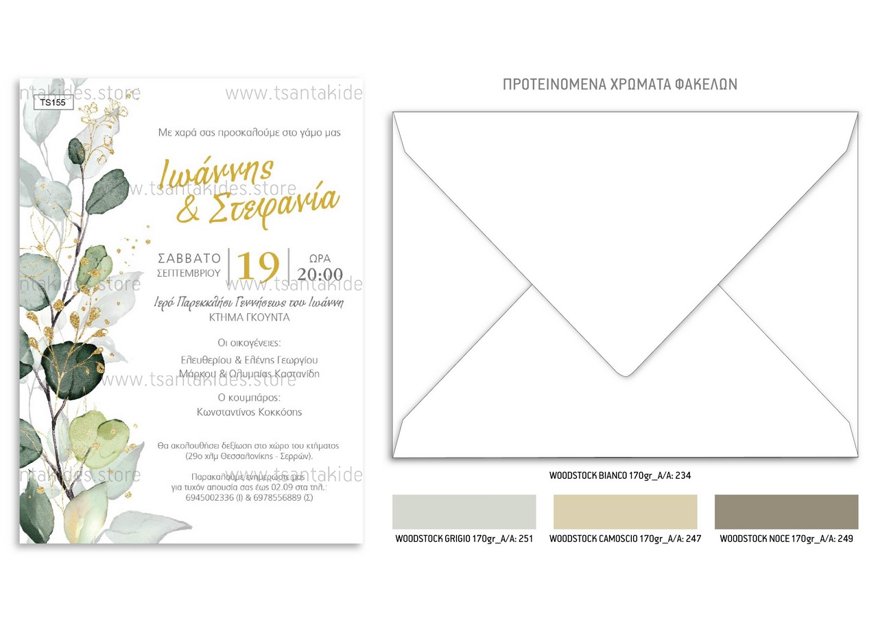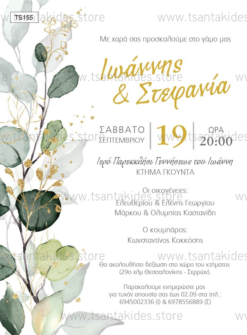Προσκλητήριο γάμου με greenery design και χρυσαφί λεπτομέρειες.