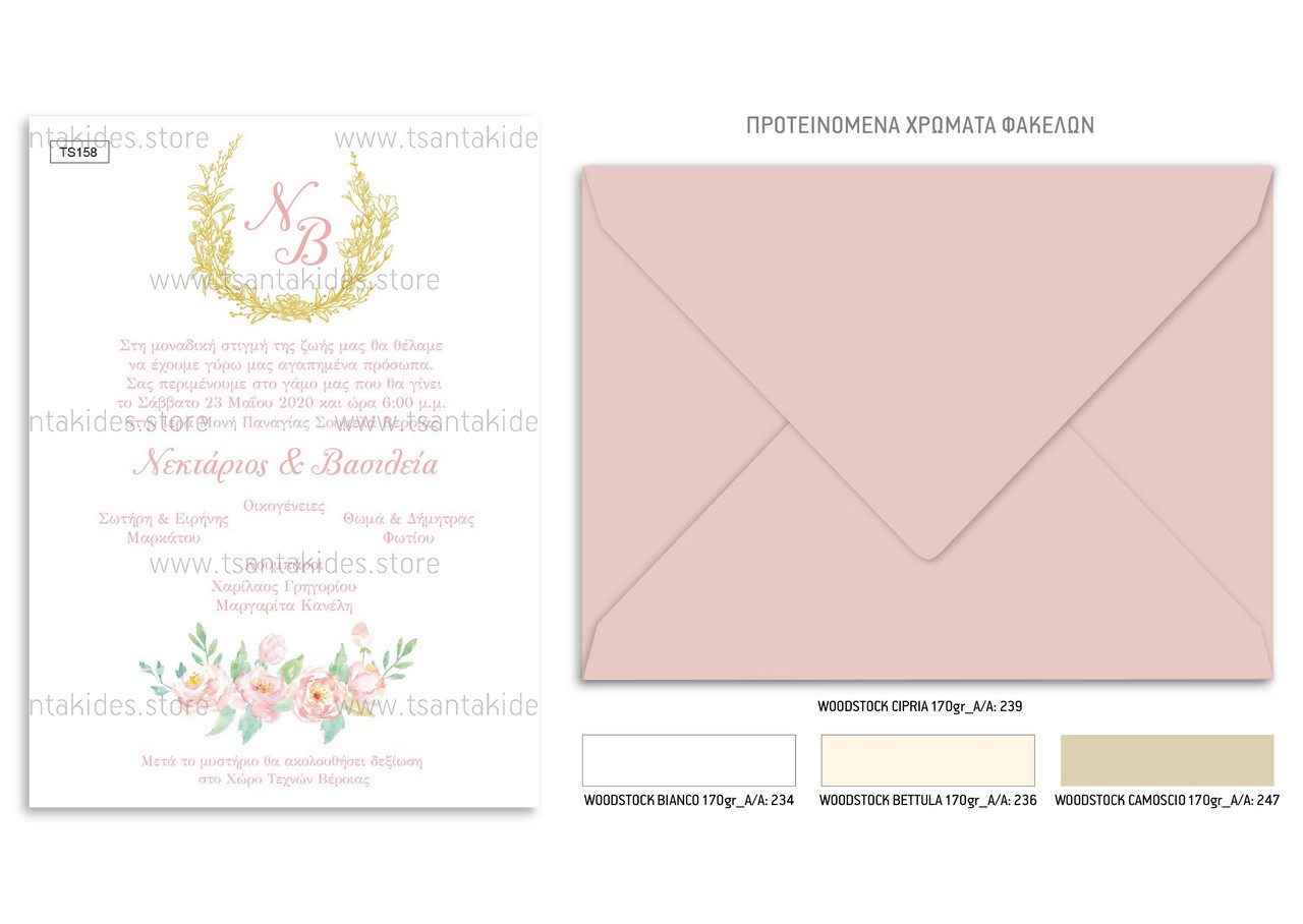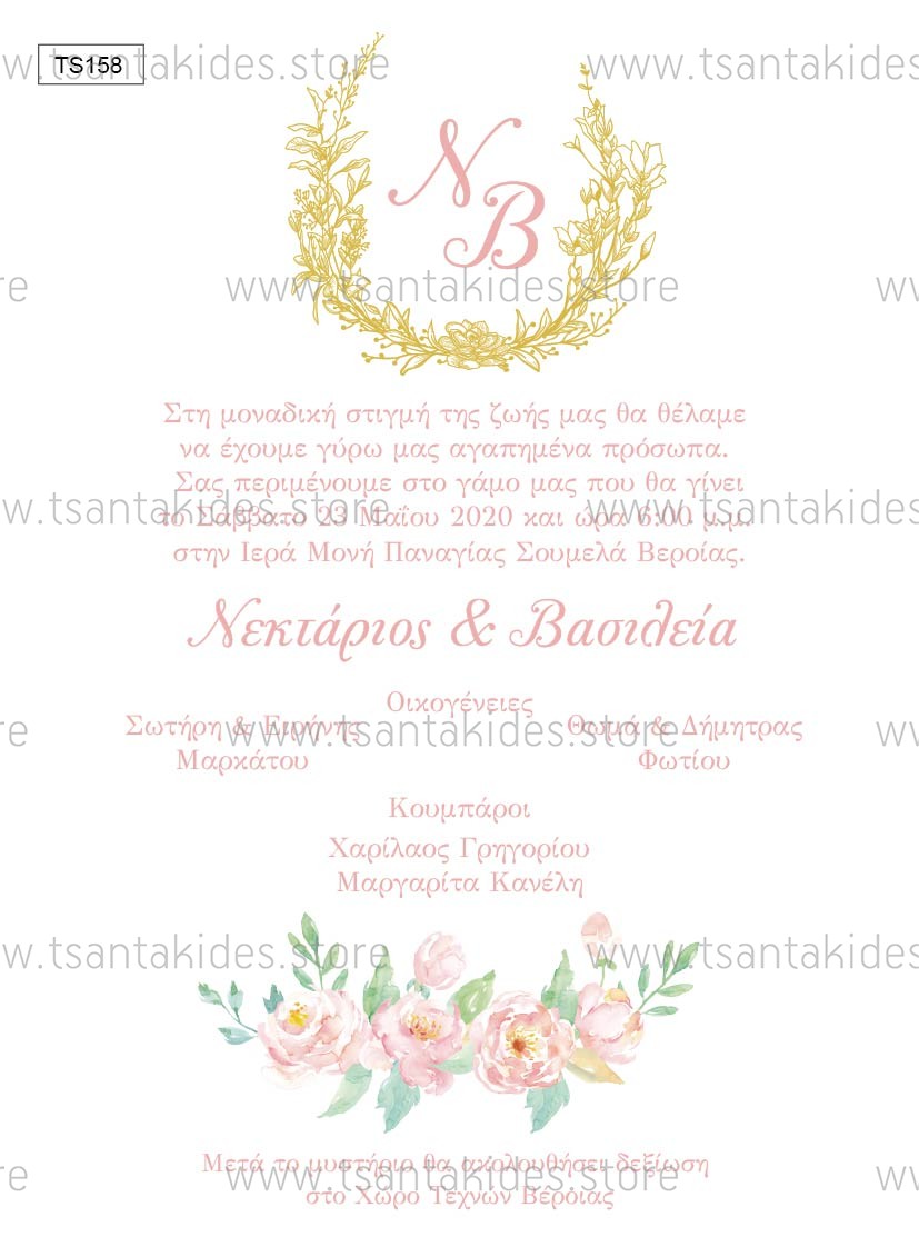 Προσκλητήριο γάμου με λογότυπο και floral λεπτομέρειες.