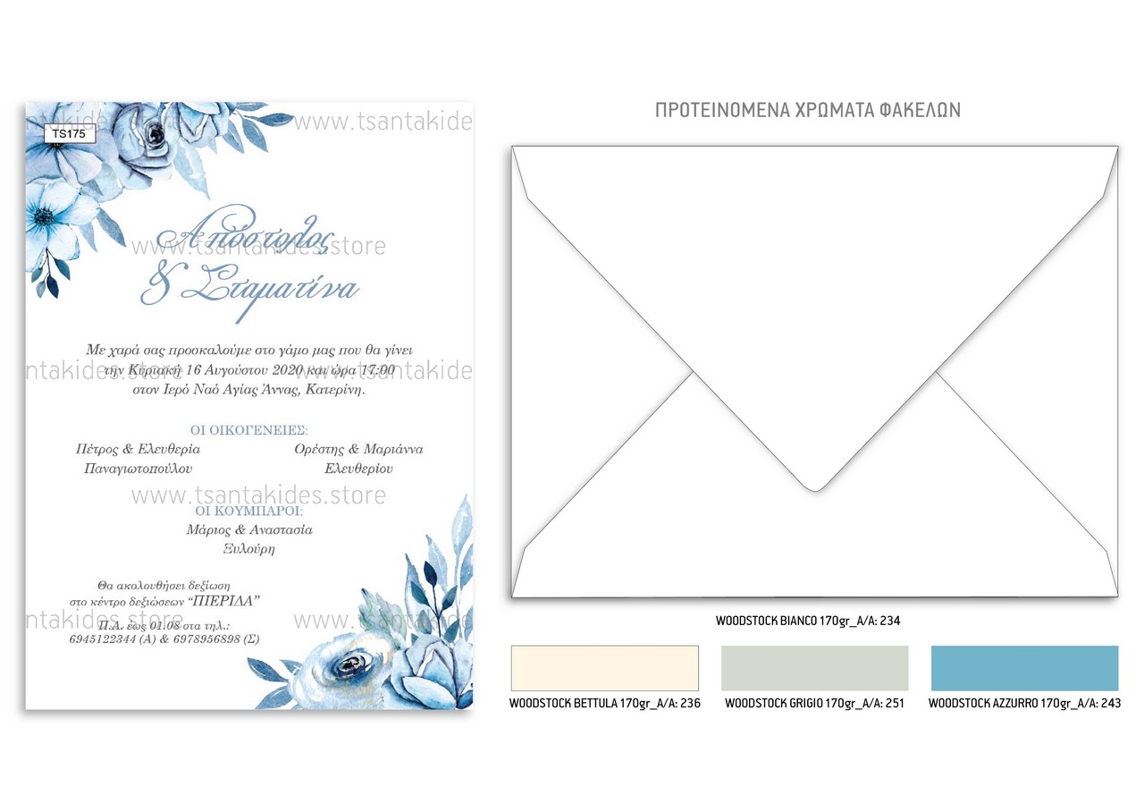 Προσκλητήριο γάμου με floral σχεδιασμό σε γαλάζιους pastel χρωματισμούς.
