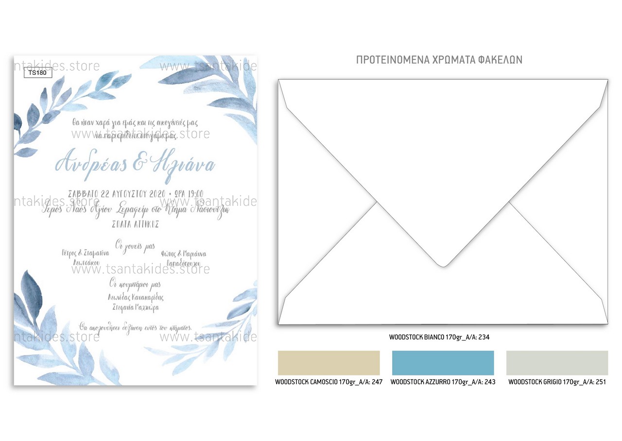 Προσκλητήριο γάμου με κλαδιά σιελ χρωματισμούς.