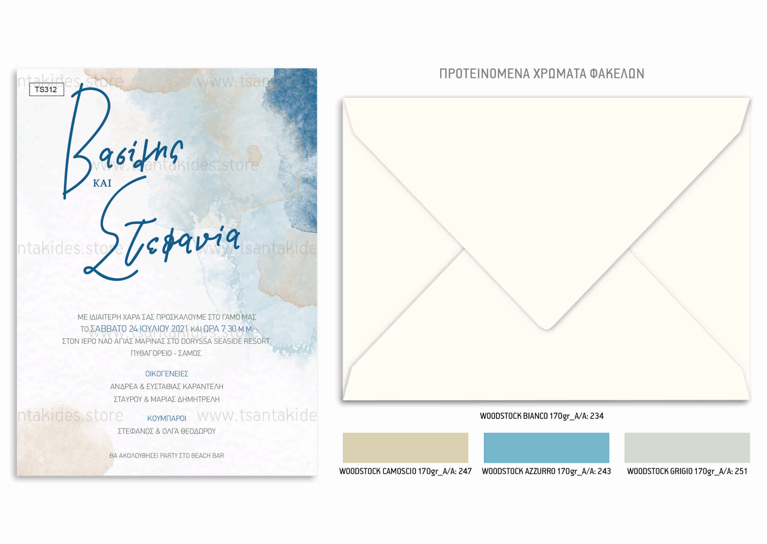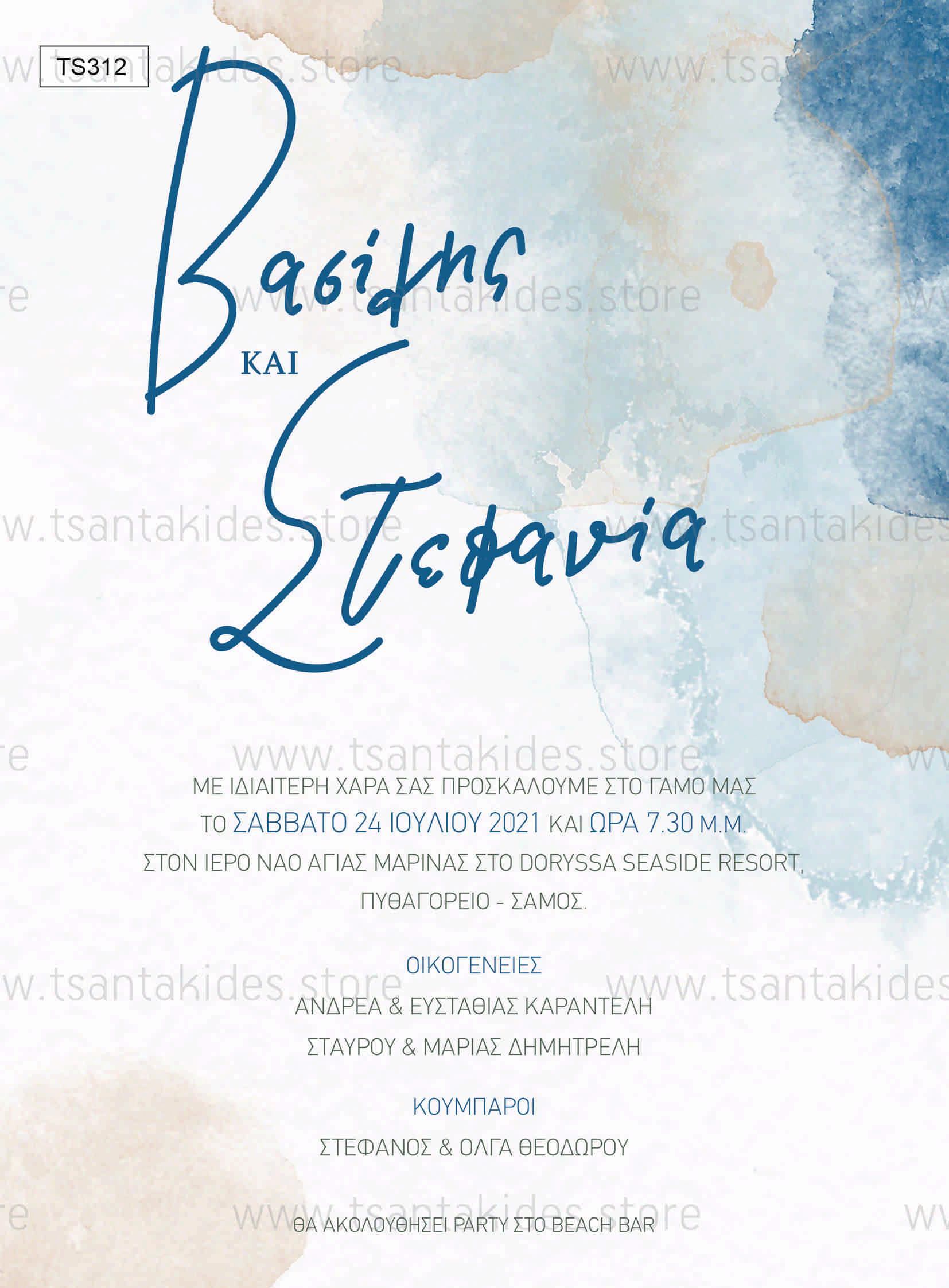 Προσκλητήριο γάμου με minimal σχεδιασμό και dusty blue watercolor.