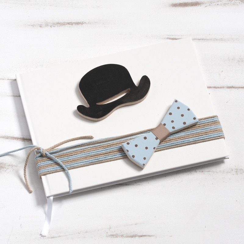 - Βιβλίο ευχών λευκό εξωτερικά από χοντρό χαρτόνι, διακοσμημένο με καπελάκι μαύρο παπιγιόν σιέλ-καφέ και δεμένο με κορδόνια σιέλ-καφέ ΖΒΕ411