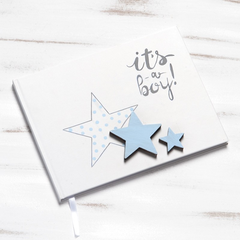 - Βιβλίο ευχών λευκό εξωτερικά από χοντρό χαρτόνι ζωγραφισμένο στο χέρι με αστέρι πουά σιέλ και διακοσμημένο με ξύλινα αστεράκια σιέλ,ενώ πάνω στο βιβλίο αναγράφεται και η φράση “it’s a boy” ΖΒΕ420