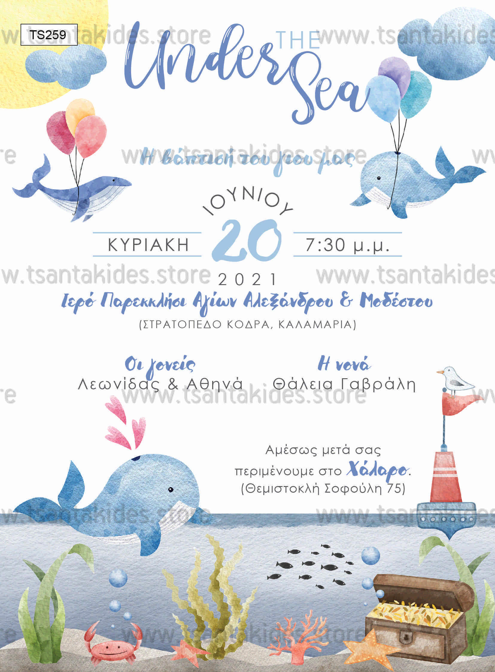Προσκλητήριο βάπτισης για αγόρι με θέμα τη θάλασσα και το μικρό φαλαινάκι.