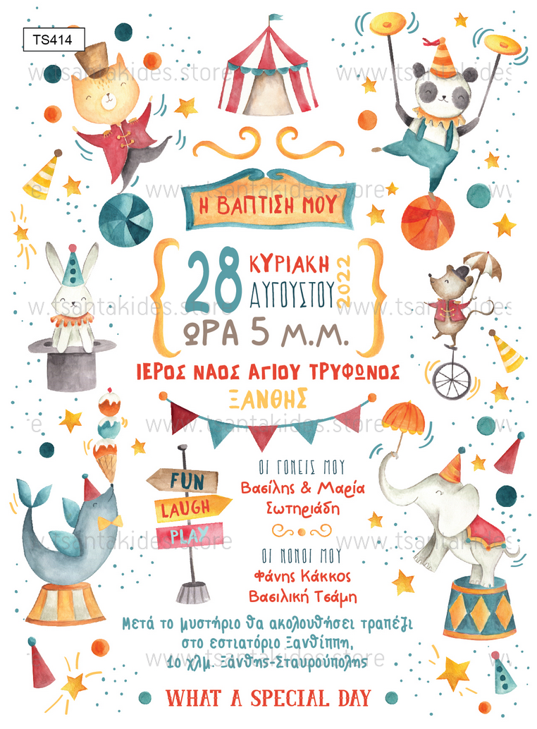 Προσκλητήριο βάπτισης για αγόρι με θέμα Circus.