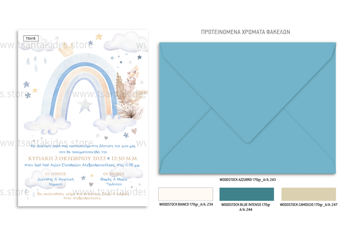 - Στολισμός (προαιρετικός): 2 κορδέλες σατέν 3χιλ. ή 1 κορδέλα σατέν 2-2,5εκ στα χρώματα του προσκλητηρίου. Δείτε τις κορδέλες εδώ. Υπάρχει η δυνατότητα αντικατάστασης των υλικών στολισμού με αυτά της επιλογής σας, από τον κατάλογο μας, κατόπιν συνεννόησης. Δείτε τον κατάλογο μας εδώ. Στα παπυράκια και τα μονόκαρτα συμπεριλαμβάνεται και καρτελάκι για να γράψετε τα ονόματα των καλεσμένων σας.