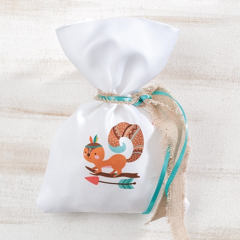 - Μπομπονιέρα βάπτισης Υφασμάτινο λευκό πουγκί με print σκίουρο Π860, κορδέλα λονέτα με ξέφτια σε natural χρώμα και κορδέλα 3mm
