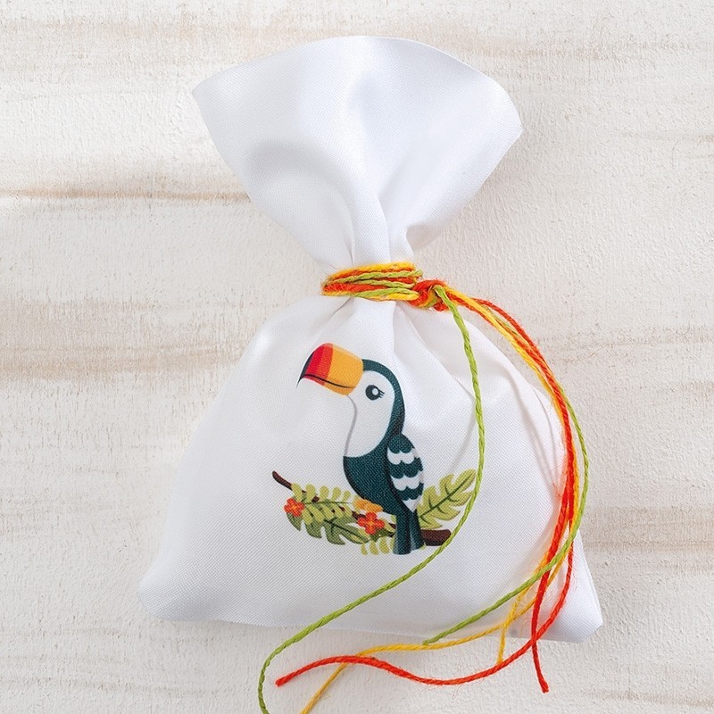 - Μπομπονιέρα βάπτισης Υφασμάτινο λευκό πουγκί με print toucan Π900 και κορδόνια σε διάφορα χρώματα