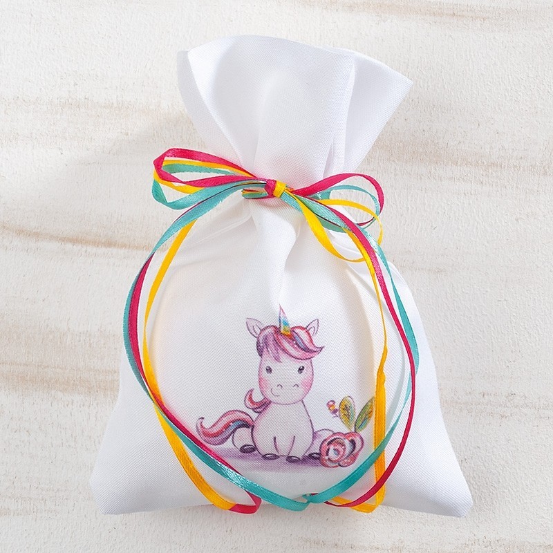 • Μπομπονιέρα βάπτισης Υφασμάτινο λευκό πουγκί με print μονόκερο Π891 και κορδέλες 3mm σε διάφορα χρώματα