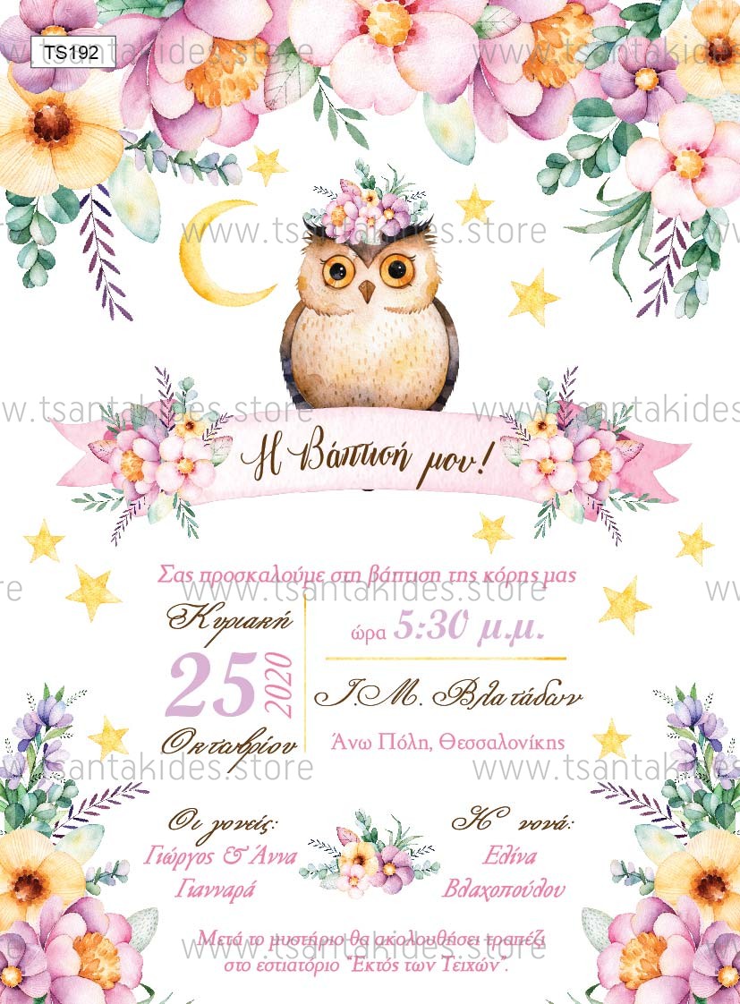 Προσκλητήριο βάπτισης για κορίτσι με θέμα την κουκουβάγια.