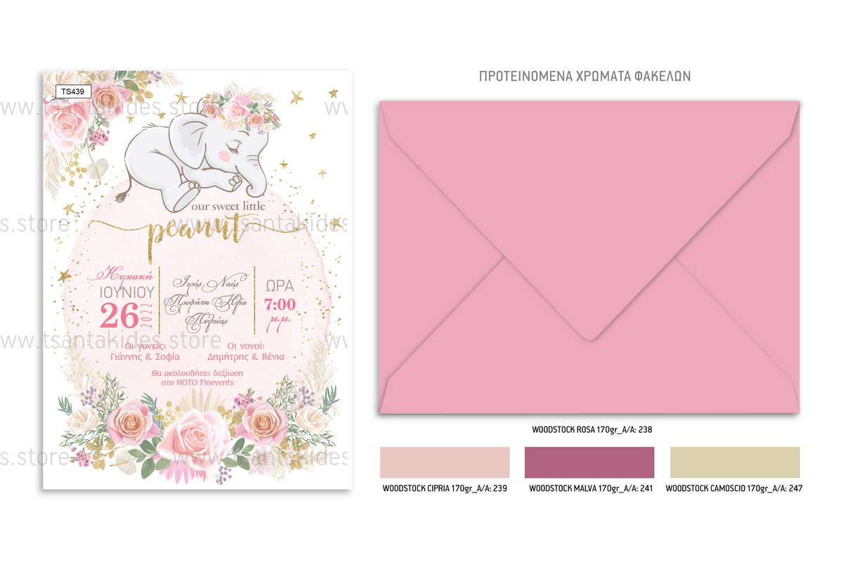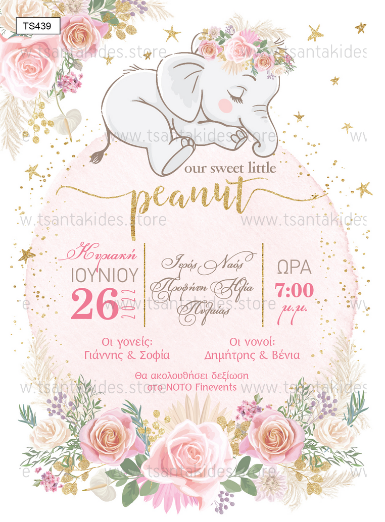 Προσκλητήριο βάπτισης για κορίτσι με θέμα Baby Girl Elephant.