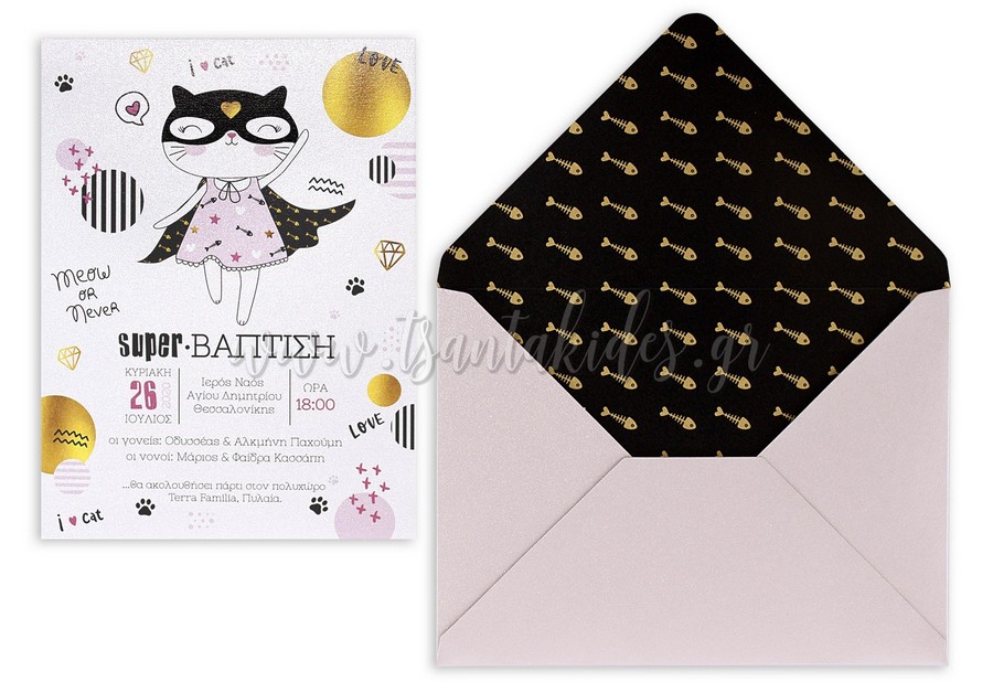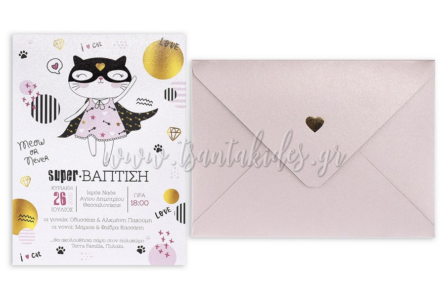 Προσκλητήριο βάπτισης για κορίτσι με θέμα τη γάτα super ήρωα. Το προσκλητήριο διαθέτει φάκελο διάστασης 19,5×14,5cm σε ροζ – χρυσό περλέ χαρτί 300γρ. με εκτύπωση στην εσωτερική πλευρά και χρυσοτυπία μια καρδιά στο εξωτερικό του φακέλου. Η κάρτα του προσκλητηρίου είναι εκτυπωμένη σε λευκό περλέ χαρτί 300γρ.