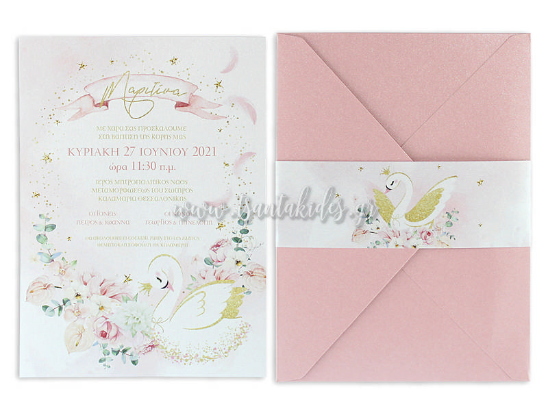Προσκλητήριο βάπτισης για κορίτσι με θέμα τον κύκνο. Το προσκλητήριο διαθέτει φάκελο διάστασης 22×16cm σε rose περλέ χαρτί 250γρ. Η εσωτερική κάρτα είναι εκτυπωμένη σε λευκό περλέ χαρτί 300γρ με χρυσές λεπτομέρειες και floral στοιχεία. Το προσκλητήριο διαθέτει λωρίδα διάστασης 34×5,5cm εκτυπωμένη σε λευκό περλέ χαρτί 120γρ στο ίδιο θέμα.